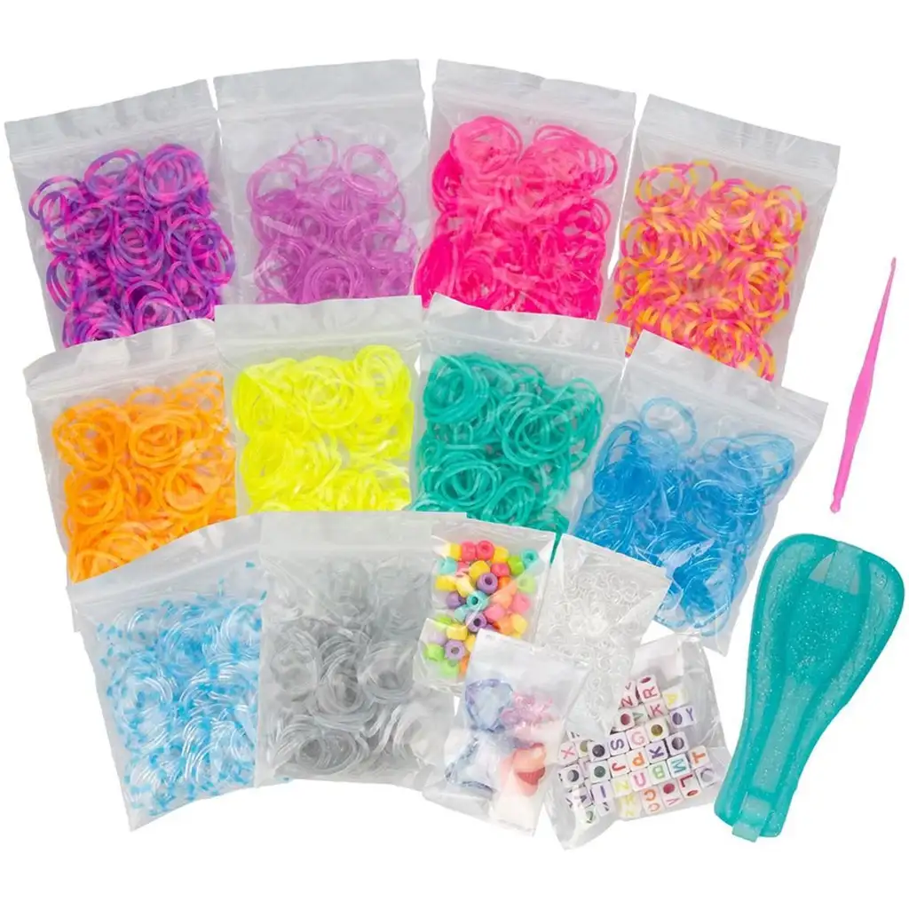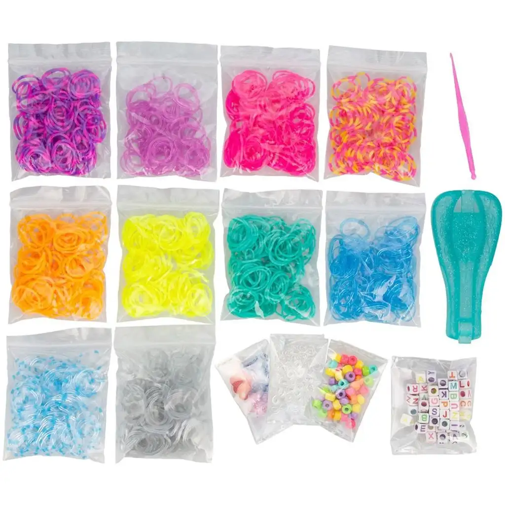 Balenie obsahuje 1000 gumičiek rôznych farieb, takže možnosti kombinovania vzorov a farieb sú takmer nekonečné. Vďaka priloženým korálkam s písmenkami abecedy a farebným korálkam môžete na náramky navliecť mená alebo odkazy, čím ich urobíte ešte osobnejšími. Sada obsahuje aj praktický háčik a nový typ trblietavého náramkového nástroja EZ Loom, vďaka ktorému bude tvorenie ešte jednoduchšie a rýchlejšie.