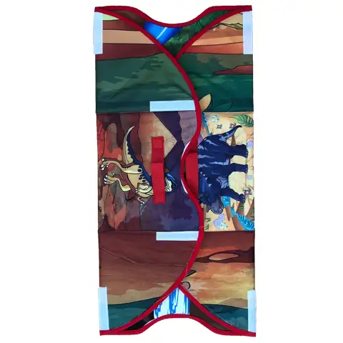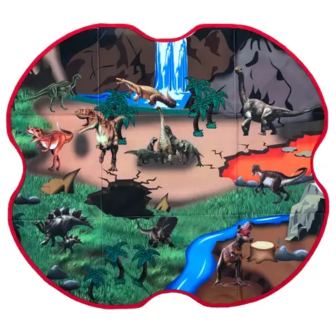 Zásobník a koberec na hru 2v1 môže byť praktickou voľbou, pretože po hre z koberca môžete vytvoriť zásobník, do ktorého môžete vložiť doplnky, existujúce dinosaury alebo hocijaké hračky a hracie figúrky. Vďaka veľkému rozmeru v zásobníku môžete skladovať veľa vecí. Vrchná krabice je zo silnej lepenky, s čím môže byť rýchlo zatvorená krabica, čo môžete uložiť pod posteľ alebo do skrine. Krabica môže byť premenená na koberec za okamih, z ktorého potom pomocou suchých zipsov môže vytvoriť opäť zásobník.