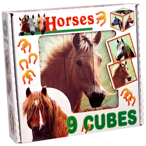 Vylož obrázok! Z 9 malých kociek je možné vytvoriť 6 rôznych obrázkov, všetky v tematike "Kone"! Deti si zvolia obrázok, ktorý si prajú z kociek vyložiť, potom pretáčaním kociek sa snažia nájsť časť zvoleného obrázka a umiestnia ho na správne miesto. Vzniknutý konečný obrázok určite poteší každé malé dieťa.