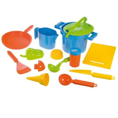 Keď je tu dobré počasie, tak nastal čas ísť von do prírody alebo na hracie ihrisko, v pieskovisku sa budete výborne zabávať s týmto setom, v ktorom sa nachádzajú všetky dôležité veci, ktoré sú potrebné na vyhotovenie chutného obeda. Môžete pripraviť aj zmrzlinu, ku ktorému nájdete kornútok aj náradie na vyhotovenie kopčekov. V hrnci môžete uvariť polievku ku ktorej nájdete všetko. Set so svojimi jemnými farbami sa dozaista zapáči vašim deťom a budú sa s ním úžasne zabávať. Môžu spoznať jednotlivé príslušenstvá a môžu okoštovať svet varenia.