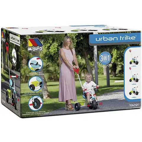 Aj malé deti sa s pomocou tejto skvelej trojkolky môžu zoznámiť so zážitkami bicyklovania, čo môžu vykonávať v úplnom bezpečí na veľkú radosť rodičov. Trojkolka Urban Trike so svojimi veselými farbami a bezpečným dizajnom je vyrobená pre desaťmesačné deti. Pedál na prednom kolese sa ľahko používa, zatiaľ čo veľké plastové sedadlo je pre deti pohodlné. K bezpečnosti prispieva aj bezpečnostný pás, ktorý je možné pripevniť k sedadlu, ako aj tyč s nastaviteľnou dĺžkou.