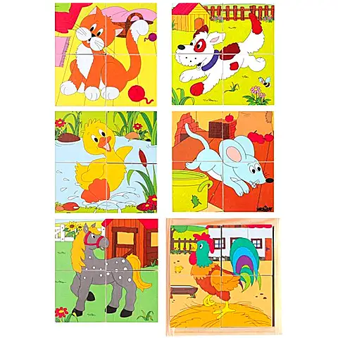 Klasické kocky sú aj dnes obľúbenou hračkou detí, ktoré nielen dobre pobavia ale nenáročne rozvíjajú schopnosť logického myslenia a fantáziu. Zo 4 malých kociek je možné pretáčaním kociek vytvoriť 6 rôznych obrázkov v tematike "Domáce zvieratká"!