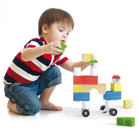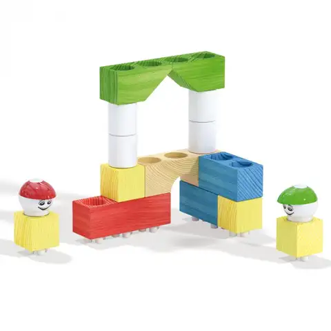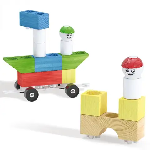 Táto špeciálna skladacia hra je inovatívnou kombináciou drevených a umelých skladacích prvkov, ktoré keď spojíme tak z nich môžeme vyhotoviť nekonečné formy budov za jeden okamih. Vďaka zabudovaným umelým spájacím panelom v drevených kockách vynikajúco zapadajú do seba drevené a umelé súčiastky, a tak iba tvoja predstavivosť môže stanoviť limity, že v skutočnosti čo vyhotovíš. V sete nájdeš kolesá a bábky, ktoré môžu byť veľmi účinné ak by si chcel zostaviť jedno klasické vozidlo.