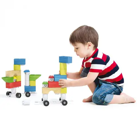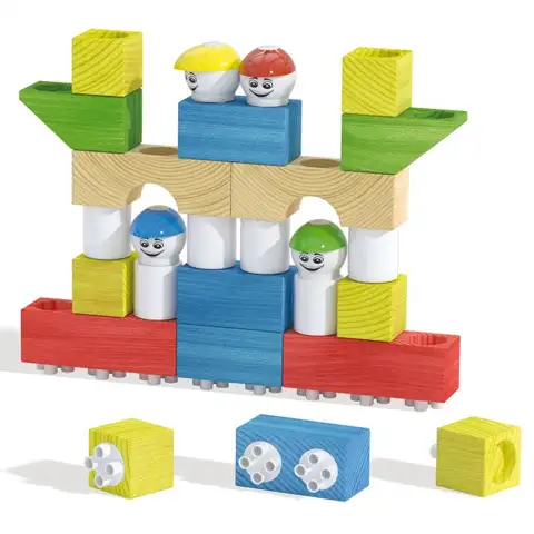 Popusť uzdu svojej fantázie a vyhotov špeciálne zaujímavé budovy v ktorom Ti bude na pomoci Modi Bloc Premium skladacia hra pozostávajúca z drevených a umelých súčiastok. Táto špeciálna skladacia hra je inovatívnou kombináciou drevených a umelých skladacích prvkov, ktoré keď spojíme tak z nich môžeme vyhotoviť nekonečné formy budov za jeden okamih. V sete nájdeš kolesá a bábky, ktoré môžu byť veľmi účinné ak by si chcel zostaviť jedno skvelé vozidlo. Vďaka zabudovaným umelým spájacím panelom v drevených kockách vynikajúco zapadajú do seba drevené a umelé súčiastky, a tak iba tvoja predstavivosť môže stanoviť limity, že v skutočnosti čo vyhotovíš.