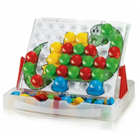 Perfektná sada pre detičky od 2 rokov, vďaka ktorej si môžu ľahko vytvoriť svoje prvé mozaikové vzory zo 48 veľkých, nerozbitných gombíkov. Farebné gombíky sa vkladajú do priehľadnej dosky s otvormi. Pod dosku možno ľahko vložiť jednu z 16 kariet s predlohami (s obrázkami alebo vzormi). Tabuľka je usadená v kufríku v naklonenej polohe. Hračka rozvíja vizuálne-manuálna koordináciu, motoriku a tvorivé myslenie.