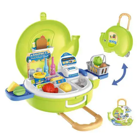 Tento mimoriadne milý kufor na kolieskach ukrýva veľké množstvo vzrušujúcich vecí, pretože po otváraní kufra uvidíte skutočný supermarket. V súprave je pokladnica, nákupný košík a rôzne produkty, ktoré deti môžu zakúpiť. Súprava vďaka nápaditému kufrovému dizajnu sa ľahko skladuje a prepravuje.