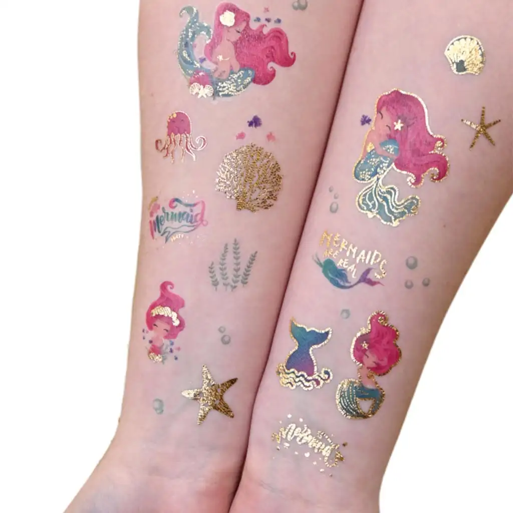Objavte nádherný podmorský svet s týmto setom tetovačiek Morská panna, ktorý je zdobený zlatom, čo vytvára iskrivý efekt! Tieto dočasné tetovacie nálepky sú vysoko kvalitné, takže si zachovávajú svoju živú farbu a detaily po dlhú dobu, dokonca aj niekoľko dní. Ponorte sa do hlbín mora a nechajte sa očariť čarovným svetom morských panien a iných vodných živočíchov a rastlín!