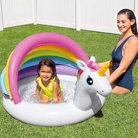 Tento baby bazén Unicorn bude okázalým prvkom záhrady, pretože bazén má skutočne krásny vzhľad, čo sa určite bude páčiť deťom. Biely nafukovací bazén bol vyrobený vyslovene pre malé deti, takže má nižší okraj, je vybavený tienidlom. Spodná časť bazéna je možné tiež nafúknuť, aby deti mohli pohodlne užívať osviežujúce kúpanie. Usmievavá farebná hlava jednorožca pozýva deti na hru, ktoré sa môžu zúčastniť veselej zábavy.