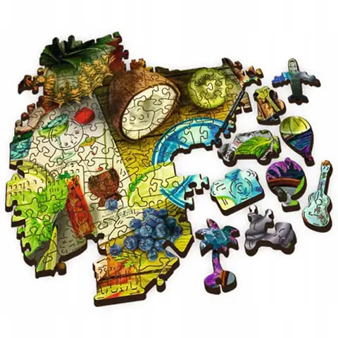 Ak hľadáte pre niekoho skutočne výnimočné a exkluzívne puzzle, tak z tohto setu určite nebudete sklamaní. Puzzle dieliky sú vyrobené z dreva a sú medzi nimi také výnimočné tvary, ako gitara alebo palmový strom, navyše hotový obraz je zdobený aj farebnými koktejlami. Skladačky Trefl Wood Craft dokonale zapadajú a vďaka nekompromisným profesionálnym procesom tlače bude hotový obrázok úchvatne ostrý a farebný. Nepravidelné a tematické tvary otvárajú úplne nové dimenzie zážitkov z puzzle. Zadná strana drevených puzzle prvkov dostala dekoratívny vzor a v mene ohľaduplnosti k životnému prostrediu sa celá sada dodáva v krabici vyrobenej z recyklovanej lepenky.
